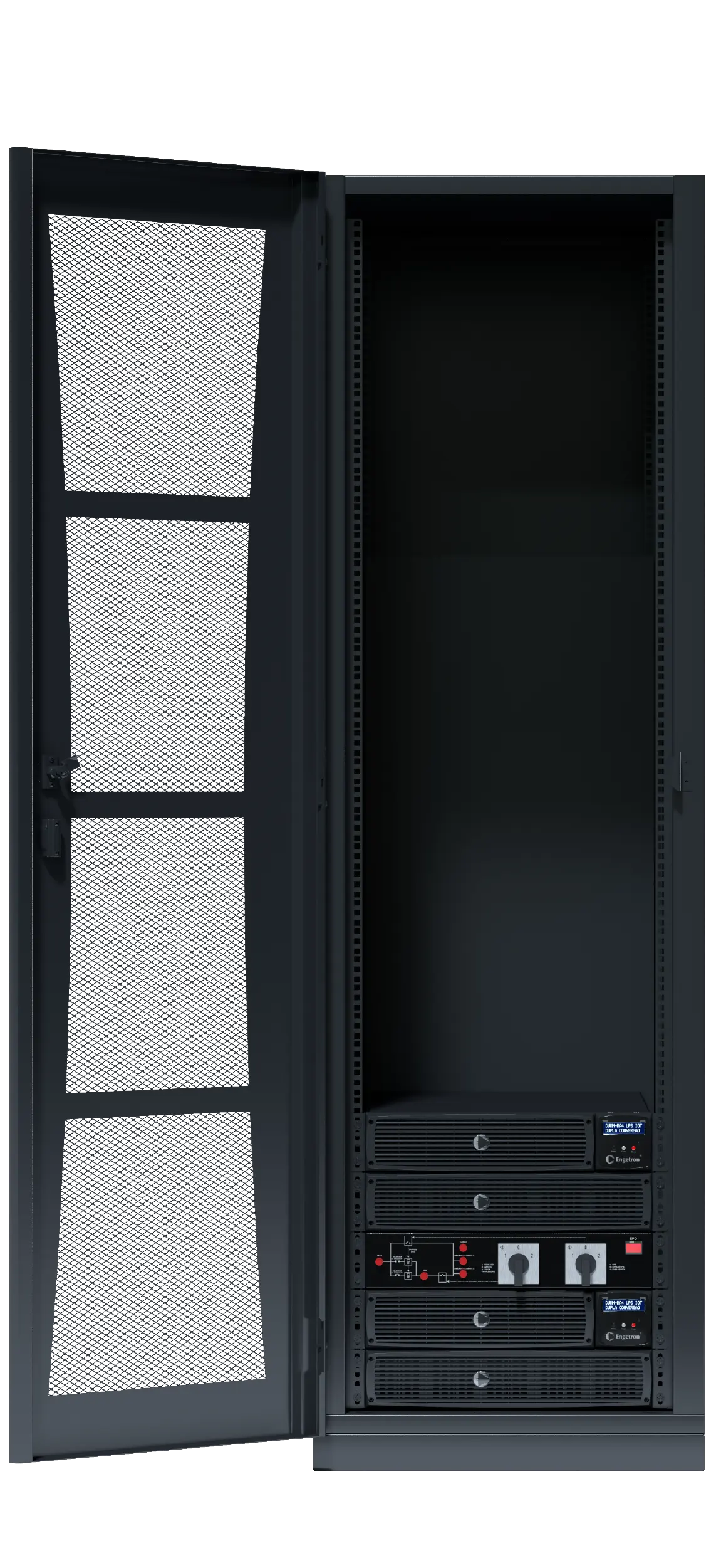 Rack solutions with modular Engetron UPS/UPs for up to 6 hours and up to 35U ranges available for IT loads, plus a complete line of accessories for space optimization.